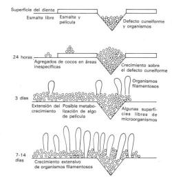 bacteriana en las superficies oclusales, espacios interproximales y los cuellos dentarios. Si la placa