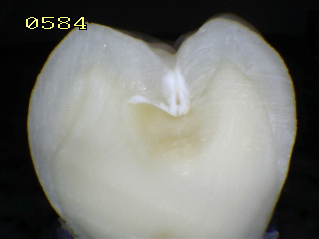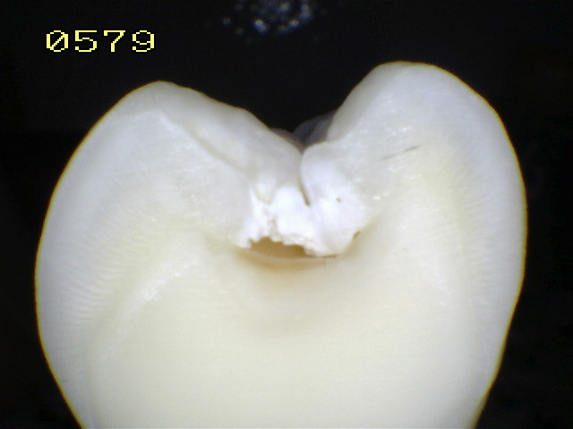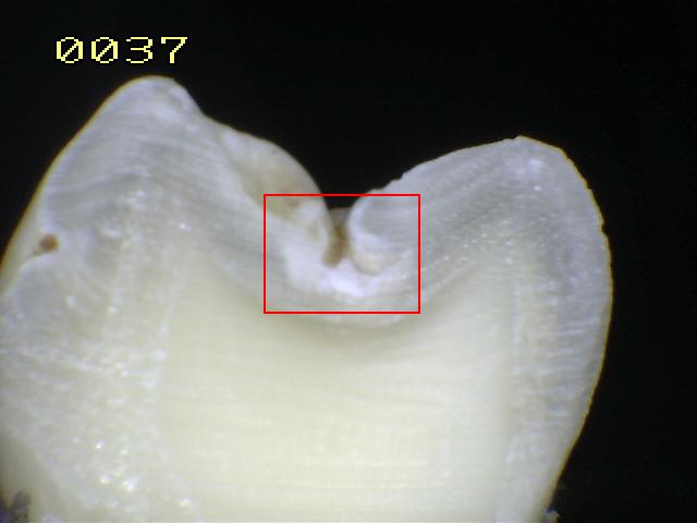 Observe como el corte en la fosa presenta caries en dentina,