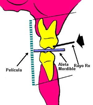 La cabeza del paciente se coloca de manera que el plano de oclusión quede paralelo al del piso. El rayo central se dirige al punto de contacto de los dientes superiores con los dientes inferiores y paralelo a sus superficies proximales, con el tubo formando un ángulo de 5 a 10º por encima del plano horizontal. Ver figura 5.