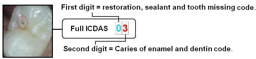 | The first digit in this case 0 identifies the surface of the tooth as "Not restored or sealed"; the second digit in this case 3 identifies the surface of the tooth as enamel and dentin caries: "Loss of enamel integrity <0.5mm., dentin not visible". The coding is done per unit area, the boundaries of the tooth surface must be known; so that the registration of the extension of caries is standardized. |