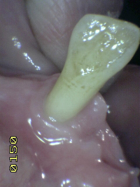 Código 0: La superficie de la raíz no presenta ninguna coloración inusual que lo distingue de los alrededores o las áreas adyacentes de la raíz, ni exhibir un defecto de la superficie, ya sea en la unión cemento-esmalte o totalmente en la superficie de la raíz. La superficie de la raíz tiene un contorno anatómico natural. Ver imagen inferior.