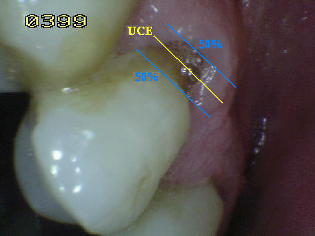 • Cuando la superficie de la corona y la raíz estén afectada por caries deben ser identificadas  independientemente.  En caso de duda porque la lesión de caries se encuentra en la unión cemento-esmalte (UCE)  debe analizarse que superficie esta más afectada o que se  extienda por lo menos 1 mm o más allá del limite de la unión cemento esmalte (UCE), en ambas direcciones cervico-incisal y cervical apical, debe considerase cual es la más extensa aplicando la regla del  50% , si existe igualdad el examinador debe decidir si la lesión es codificada como de raíz o de corona, o en su defecto puede aplicar ambas. Ver imagen derecha.