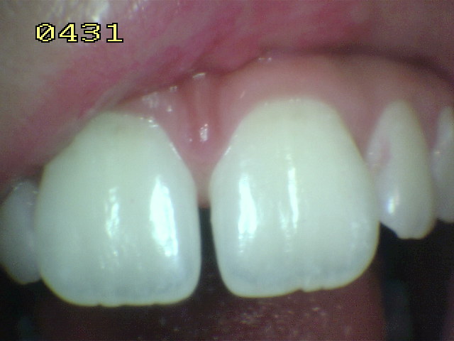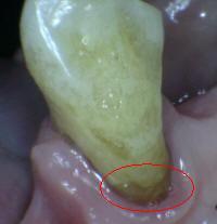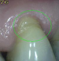 Debe eliminar la placa bacteriana de las superficies (UCE) unión cemento-esmalte por medio del cepillado mecánico o cepillo dental, para poder observar áreas de desmineralización si las hubiere. Ver círculos en amarillo.
