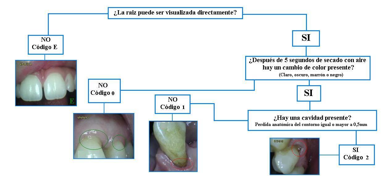 El siguiente diagrama de características de la actividad de la lesión a través de los estadíos de caries radicular ICDAS puede ser útil como referencia para el examen de caries radicular: