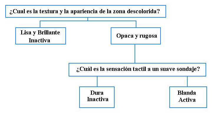 Las características de la base de la zona pigmentada en la superficie radicular se pueden utilizar para determinar si la lesión de caries radicular está activa o no. Estas características incluyen la apariencia (brillante o mate/no brillante), la ubicación en un área de retención de placa/ o no, y la percepción de la textura al sondaje suave (blanda/textura de cuero, o duro/rugoso/liso). Las lesiones de caries radicular activas están generalmente localizadas a 1 mm de la cresta del margen gingival [Ekstrand et al, 2008, 2013].