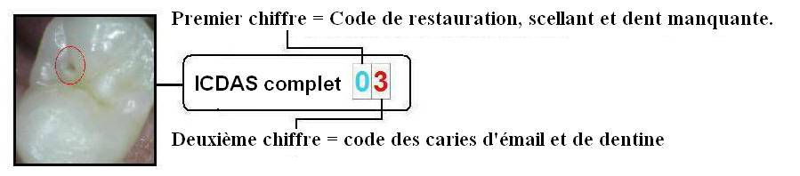 Dans ce cas, le premier chiffre 0 identifie la surface de la dent comme "non restaurée ou scellée"; le deuxième chiffre dans ce cas 3 identifie la surface de la dent en tant que carie de l'émail et de la dentine: "Perte de l'intégrité de l'émail <0,5 mm., dentine non visible". Le codage est effectué par unité de surface, les limites de la surface de la dent doivent être connues; pour que l'enregistrement de l'extension de la carie soit standardisé.