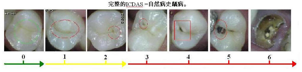 全ICDAS具有七个类别中,第一对健康的牙齿(代码0,在绿色)和有限的釉质龋,白/棕色接下来的两个(码1和2,标记为黄色色)染色。以下两个类别(代码3和4,红色)被认为是龋齿延伸到牙釉质而没有暴露的牙本质。另外两个类别(代码5和6),被认为是具有暴露牙本质的龋齿。见下图。