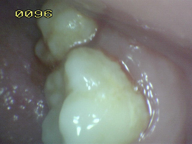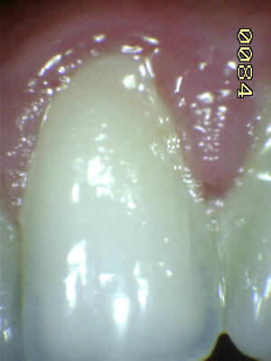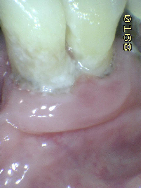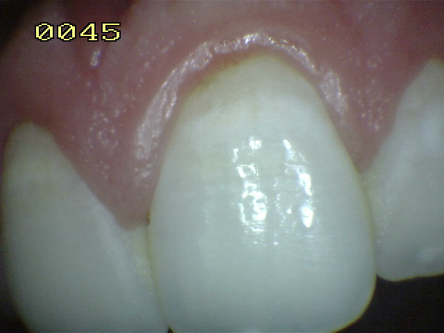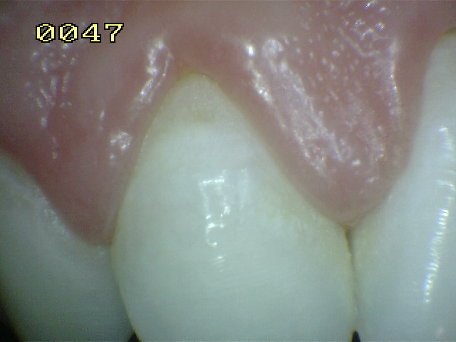 Encía levemente  inflamada con un componente fibroso. Observe el borde gingival con aspecto liso, turgente y brillante de color rojo
