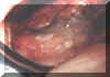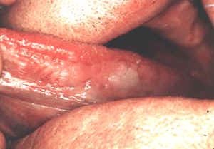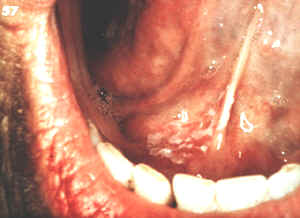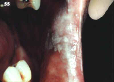 El área blanca en el mucosa bucal representa la lesión "pre-maligna".  Obviamente, su apariencia no es diferente de la queratosis benigna visto anteriormente. No hay ningún rasgo clínico por el cuál  usted puede identificar la queratosis benigna de la displasia de la mucosa.