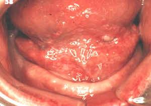 Lesión de piso posterior de boca, donde se observa un eritema débil con áreas focales de queratosis.