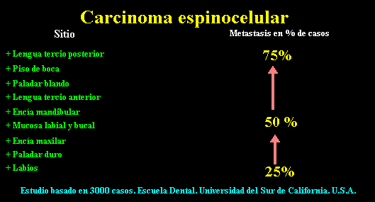Este gráfico ilustra la probabilidad de metástasis en base a la ubicación del carcinoma con respecto a la anatomía oral. Generalmente, cuanto es más posterior la lesión primaria,  mayor es la oportunidad de metástasis.