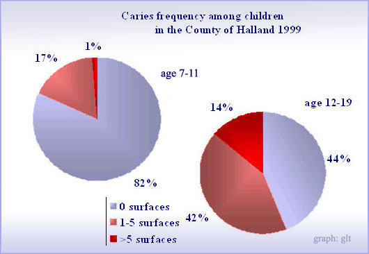 Porcentaje de superficies cariadas en niños del Condado de Halland  (1999)