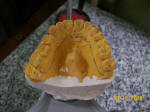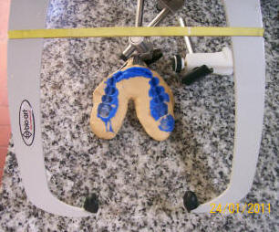 • En las imágenes inferiores derecha se observa los modelos montados, con la guía incisiva  articulable y el modelo superior con el diseño periférico de la guarda oclusal orgánica.