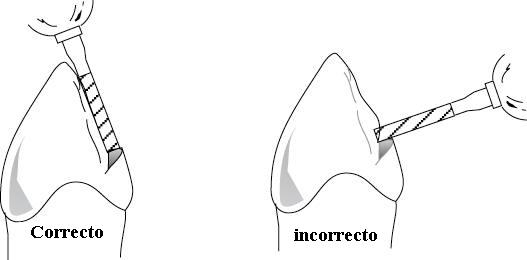 Una vez tallado nuestro apoyo debemos verificar que el ángulo sea menor a 90º con respecto al reborde marginal. Para ello el explorador es una herramienta adecuada, cuando se utiliza como se indica en el gráfico inferior.