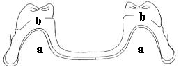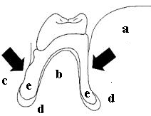 • En (d) se muestra el límite funcional de la base de prótesis que suele ser más corto que el  límite anatómico. Durante las maniobras de la impresión, se  suele deprimir el piso de boca y el fondo de surco.