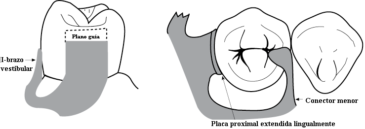 La placa lingual proximal se extiende de manera que la distancia entre el conector  menor  y la placa proximal es menor que el ancho mesiodistal del diente.