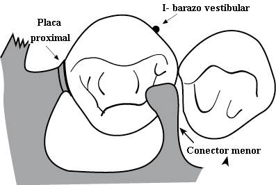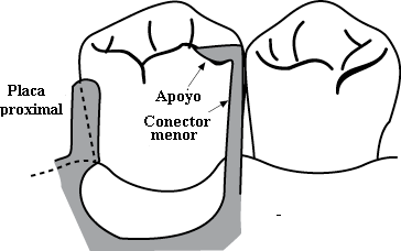 2. El apoyo se encuentra en la superficie mesio-oclusal de una superficie mesiolingual de premolar o de un canino. El conector menor se encuentra en el hueco mesio-lingual, pero no está en contacto con el diente adyacente (evita que acuñe).