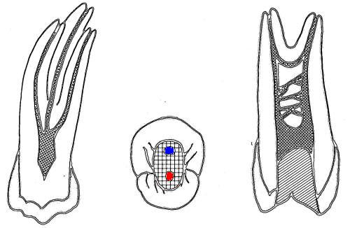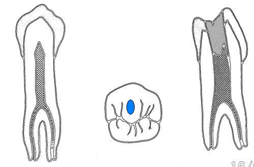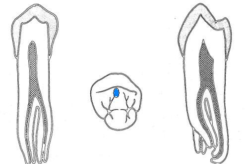 Es todo un enigma para el dentista, porque suelen tener conductos dobles que se dividen a diferentes niveles. El acceso se lleva a cavo en una posición ligeramente vestibular en relación al surco central., como indica la figura derecha. La cámara pulpar ovoide es alcanzada con fresa de fisura de extremo cortante y luego fresa redonda número 4 ó 6 de tallo largo.