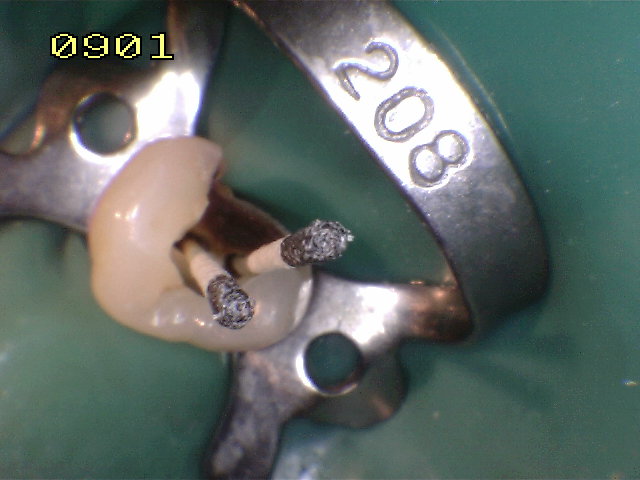Dos conductos bien delimitados, ensanchados con limas rotatorias, recidiva de caries en distal. |