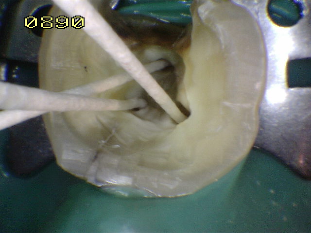 1. Eliminar el líquido de la cámara pulpar. Esto se lleva a cavo con torundas estériles empacadas suavemente en la cámara pulpar y se continua con aire a presión para que se evapore en su totalidad. El extremo de la jeringa triple no debe colocarse encima del conducto de entrada, por el riesgo de producir un efisema.