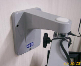 El microscopio posee un  estativo de pared, esta versión debe instalarse previamente  una cruceta de aluminio en el muro elegido, esta operación la realiza  un albañil con las indicaciones escritas por el  proveedor. Este sistema es ideal para consultorios o gabinetes reducidos, dado que ahorra espacio.