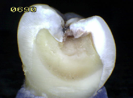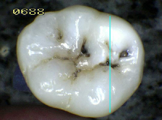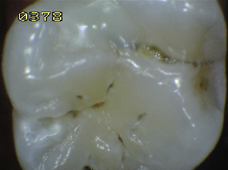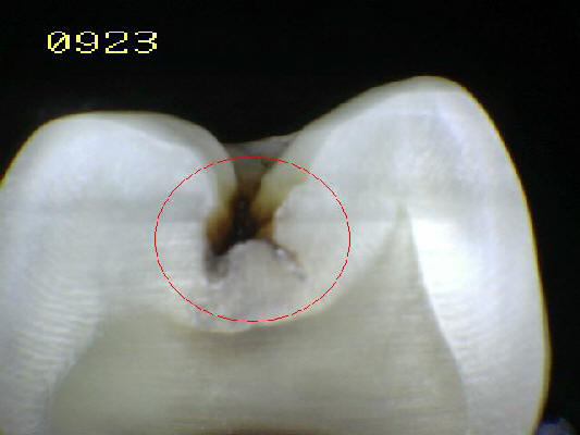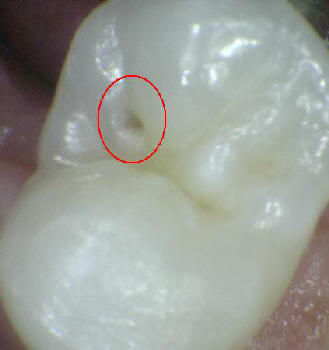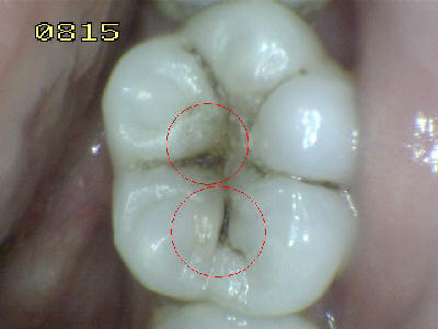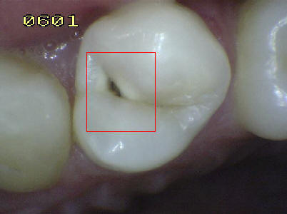 El diente visto en estado  húmedo pueden tener una clara opacidad de caries (lesión de mancha blanca) y / o decoloración marrón de caries que es más ancha que la fisura natural y la fosa, que no es consistente con la apariencia clínica de esmalte sano.  Una vez seco, se observa  una pérdida de estructura dental cariada en la entrada, o dentro de la fosa o fisura . Esto se ve visualmente como evidencia de desmineralización en la entrada o dentro de la fisura o fosa, y aunque la fosa o fisura puede aparecer sustancialmente  más ancha que lo natural, la dentina no es visible en las paredes o la base de la cavidad ó discontinuidad.